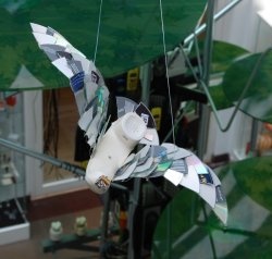 The tele birds are created by Randi Brøndel Larsen. Read more on www.randibrondel.dk. The materials are telephone parts and CD-ROM's.