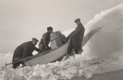 The mail often had to be transported accross straits in iceboats. The picture shows a mail conveyance over the ice between Frederikshavn and Hirsholmene in March 1940.