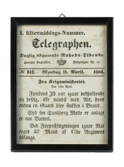 Several times a day the Copenhageners - hungry for news - received information about the battle at Dybbøl Mill. The first afternoon issue of the "Telegraphen" of 18th April 1864, the day that has gone down to Danish history as the day when Dybbøl fell, is a good source to the veracity that the increased speed of communication did not necessarily mean a better overview of the course of events.