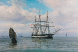 The Danish frigate, Tordenskjold, was used by the Great Nordic Telegraph Company when laying out cables in South-East Asia between Hong Kong, Shanghai, Nagasaki, and Vladivostok. On their return after 666 days of successful expedition the crew was celebrated in Copenhagen. Painting by Vilhelm Andersen, 1919. Belongs to GN Store Nord.