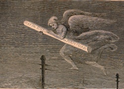 The American transcontinental telegraph line opened in 1861. The angel of peace is walking on the telegraph wire with the hope that the new telegraph line will bring peace and prosperity to America that has suffered from the Civil War.