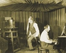 Kammersanger Emil Holm performing Mussorgskijs "The Bumblebee" in 1924. On the piano: Viktor Fischer. The studio was called "the reversed cream bun" and was situated on the ground floor on the corner of Købmagergade and Løvstræde. Today, it has been changed into an office.