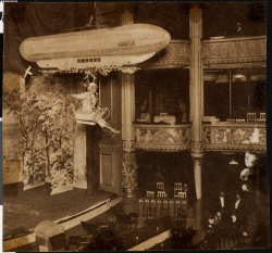 The bravura piece of the revue "The Wireless" was Kaj Allen's Hansa song, performed by Ella Gre-gers sitting under the floating airship spreading flowers over the auditorium. Photograph courtesy of The Royal Library's Map and Picture Collection.