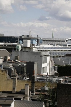 In the street we are surrounded by the hectic everyday life and the demand to be present all the time with the mobile phone always turned on. If, however, you take the lift to the museum's rooftop café, you will be entering a peaceful room where the view of the city roofs gives you a breadth of outlook and the drifting clouds or bright blue summer sky provide a kind of peace otherwise difficult to find in the big city. What we often fail to notice is that even at roof level we are in the middle of the highly strung, although silent communication that cut through the sky in all directions. The skyline of the city has changed and bears the impress of the communication in the city. Among old verdigris green spires and towers new ones have appeared in the shape of mobile telephone masts, antennas, and satellite dishes.