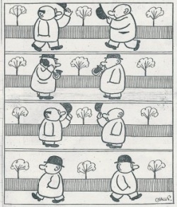 To Storm P. the tragic-comical meaninglessness of life was an important source of inspiration. He often places the humour and satire with outsiders or people far from the elite in power. He criticizes the carefree view on existence and call attention to the dangers in connection with uncritical admiration of modern development. As in one of the drawings in the exhibition which shows an Apparatus for stamping of letters. It only takes four men to ensure that the postage stamp has been pressed safely onto the letter. Rather than a classic artist he was a social critic who wanted us to see.