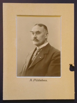 The picture of A. Mikkelsen, a medlem of FKT's board of directors during the years 1912-33, was hanging in the boardroom when it was hit by a bullet on 5th May 1945. Unknown photographer.