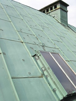 During the shooting in Odense on 5th May 1945 the Telephone House was hit by about 850 bullets of which about 450 penetrated into the building and caused considerable damage. The picture shows the copper patching which was soldered on the bullet holes. Photo: Erik Juul.