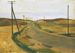 Telephone Poles in Central Jutland portrayed by the artist Erik Raadal in his painting "Highway" from 1935. Post & Tele Museum.